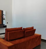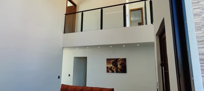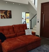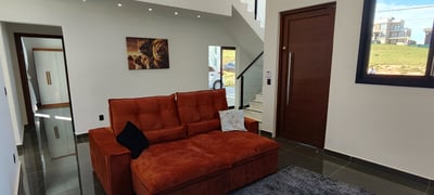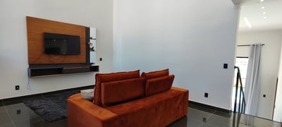 Sala grande com pé direito duplo, bem arejado e iluminação natural, com um sofá aconchegante para assisitir um filme ou uma série, comer um pipoca na companhia da sua familia e amigos